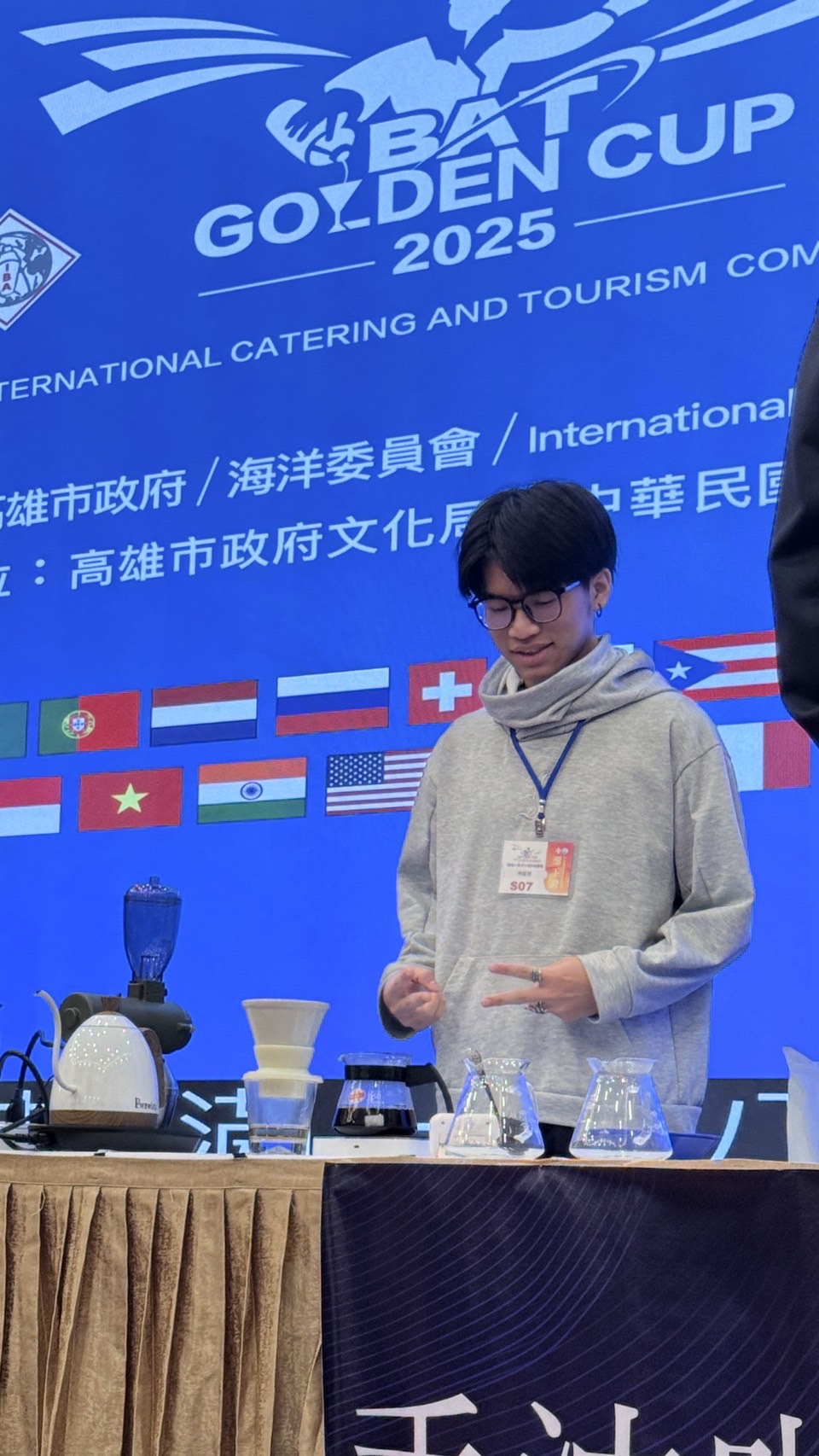 《2025金爵獎國際餐飲暨旅遊大賽》為國際性餐飲競賽之一,匯聚眾多國際頂尖餐飲選手與臺灣歷屆冠軍好手同場較勁。競賽中,參賽者須於限定時間內完成手沖咖啡的沖煮與呈現,並由專業評審依據口感平衡、萃取技術、風味層次與餘韻表現,以及整體呈現等面向進行評分。三位同學憑藉對咖啡風味的敏銳掌握與穩定純熟的沖煮手法,成功展現高度專業水準,最終由羅郁媄獲得手沖組金牌、林鉦哲獲手沖組銅牌,陳萬駿則奪下杯測組銅牌。