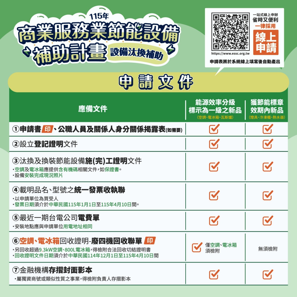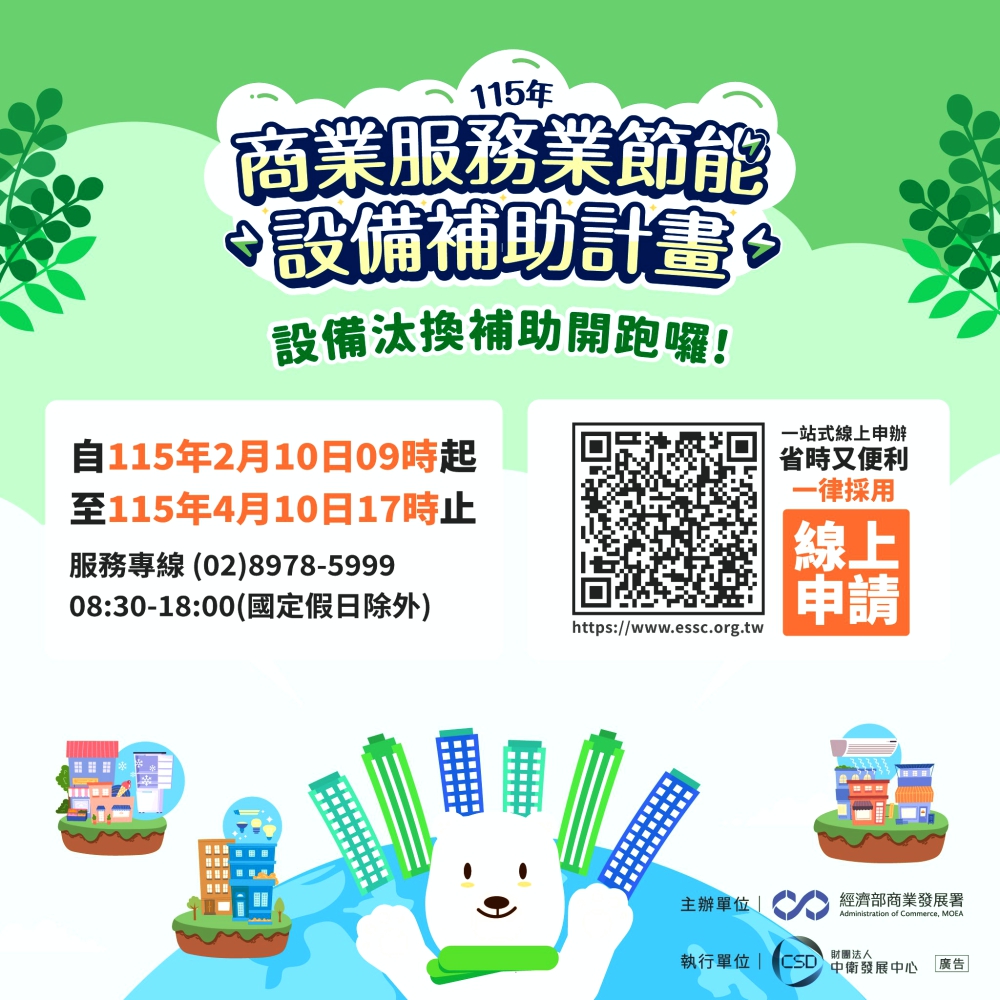 經濟部115年商業服務業節能設備汰換補助將於115年2月10日開放線上申請,有需求的企業屆時可至補助網站( https://www.essc.org.tw )提出申請。今年度補助受理至115年4月10日止,經費用罄將提前截止,請企業及早準備相關資料提出申請,以免向隅。