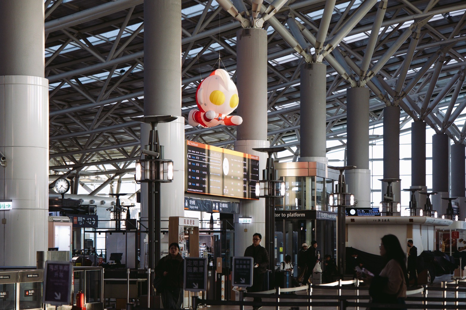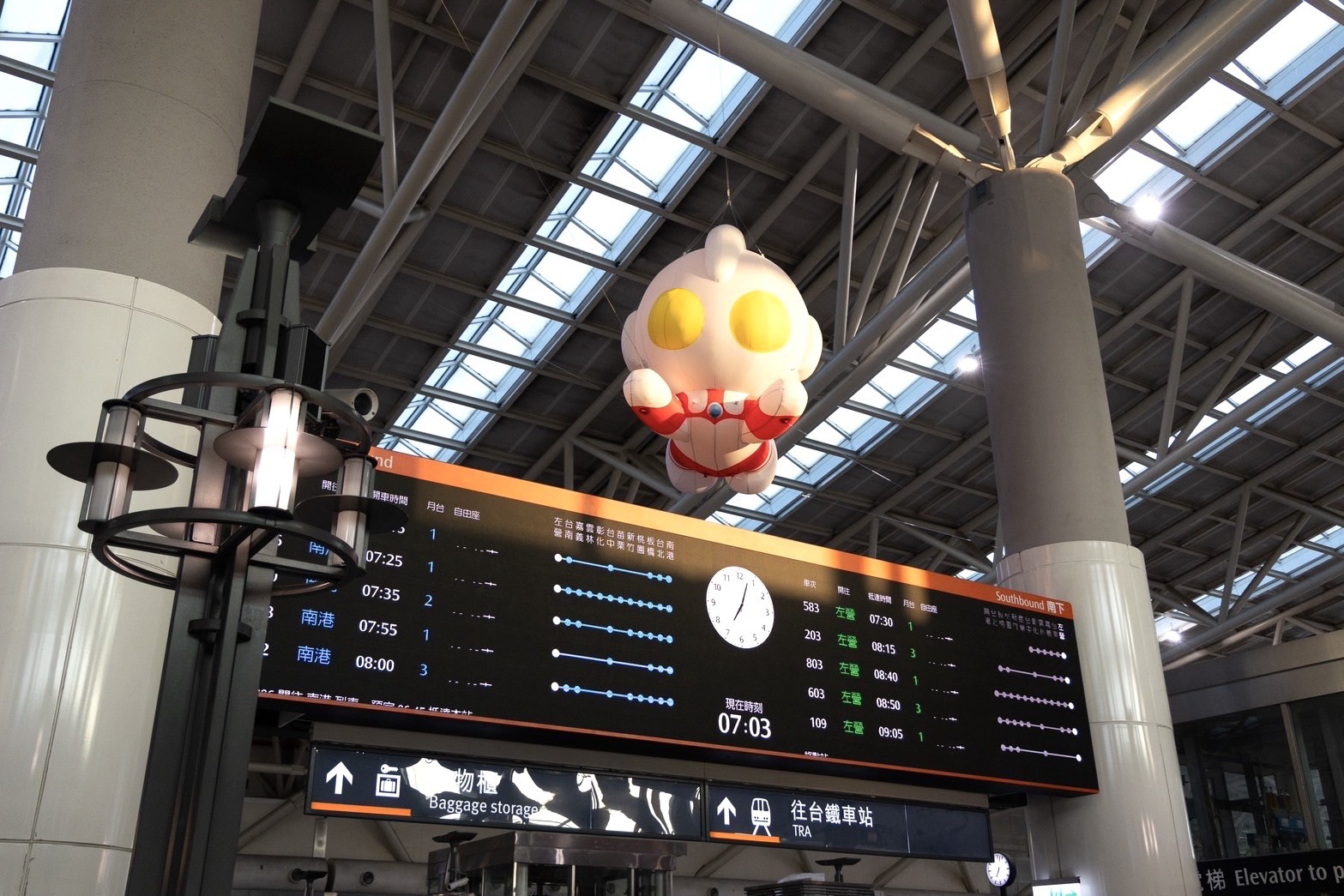 高雄市政府觀光局攜手 台灣高速鐵路股份有限公司,在 高鐵左營站 大廳列車時刻表上方,驚喜亮相超萌Q版氣膜裝置——超人力霸王空中翱翔迎賓,巨大又吸睛,氣勢滿滿卻又可愛到不行。
