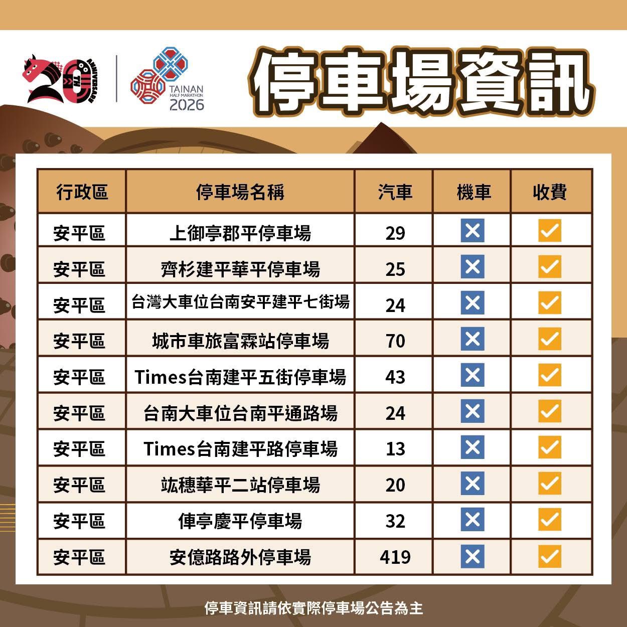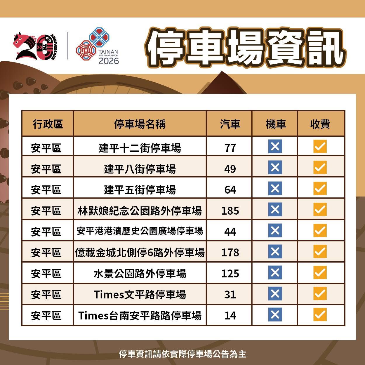 本次賽事自3月1日上午4時起陸續實施交通管制,管制區域涵蓋中西區、南區及安平區,管制路段包含:南島路、慶平路、建平路、國平路、永華路二段、中華西路二段、府前路、南門路、健康路、新樂路、新港路、漁光路、光州路、安億路、慶平路、建平路、平通路、文平路、國平路、永華路等。為減少民眾通行時間受影響,各路段採分段管制,各管制路口均有架設管制時間告示牌,賽事當日上午10時將完全解除全路段管制;另參賽民眾車輛得停放於市府周邊建平5街、建平8街、建平12街停車場、永華運動中心、府前路停18停車場等。