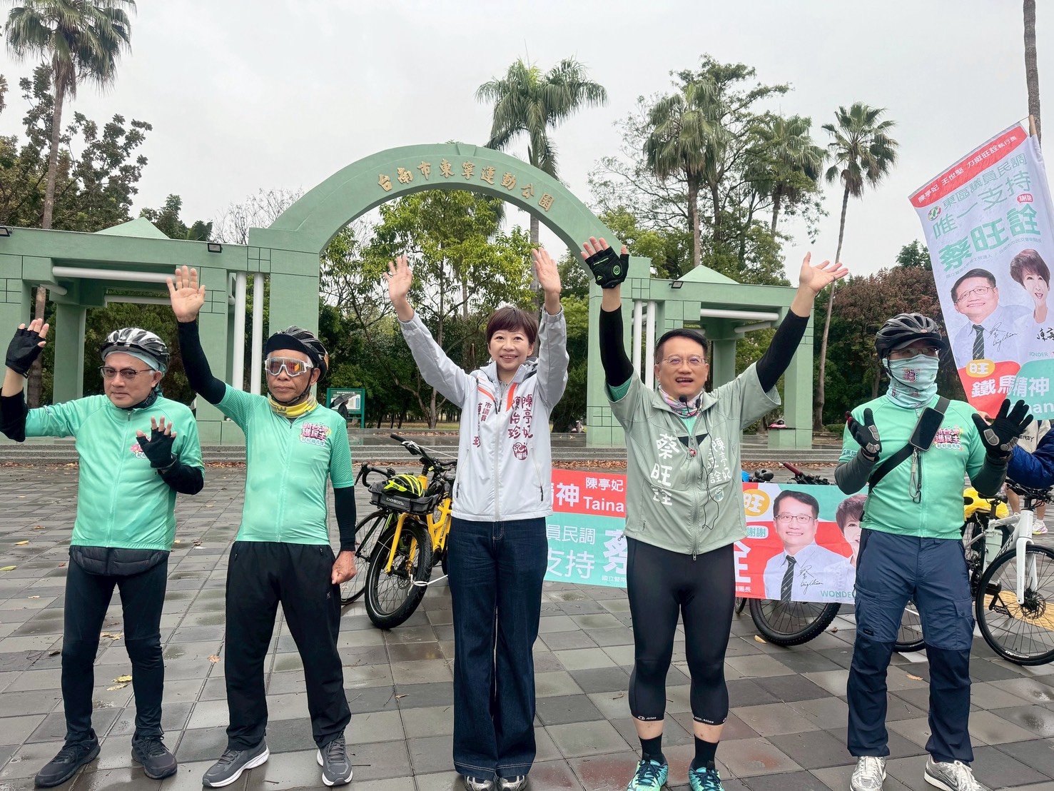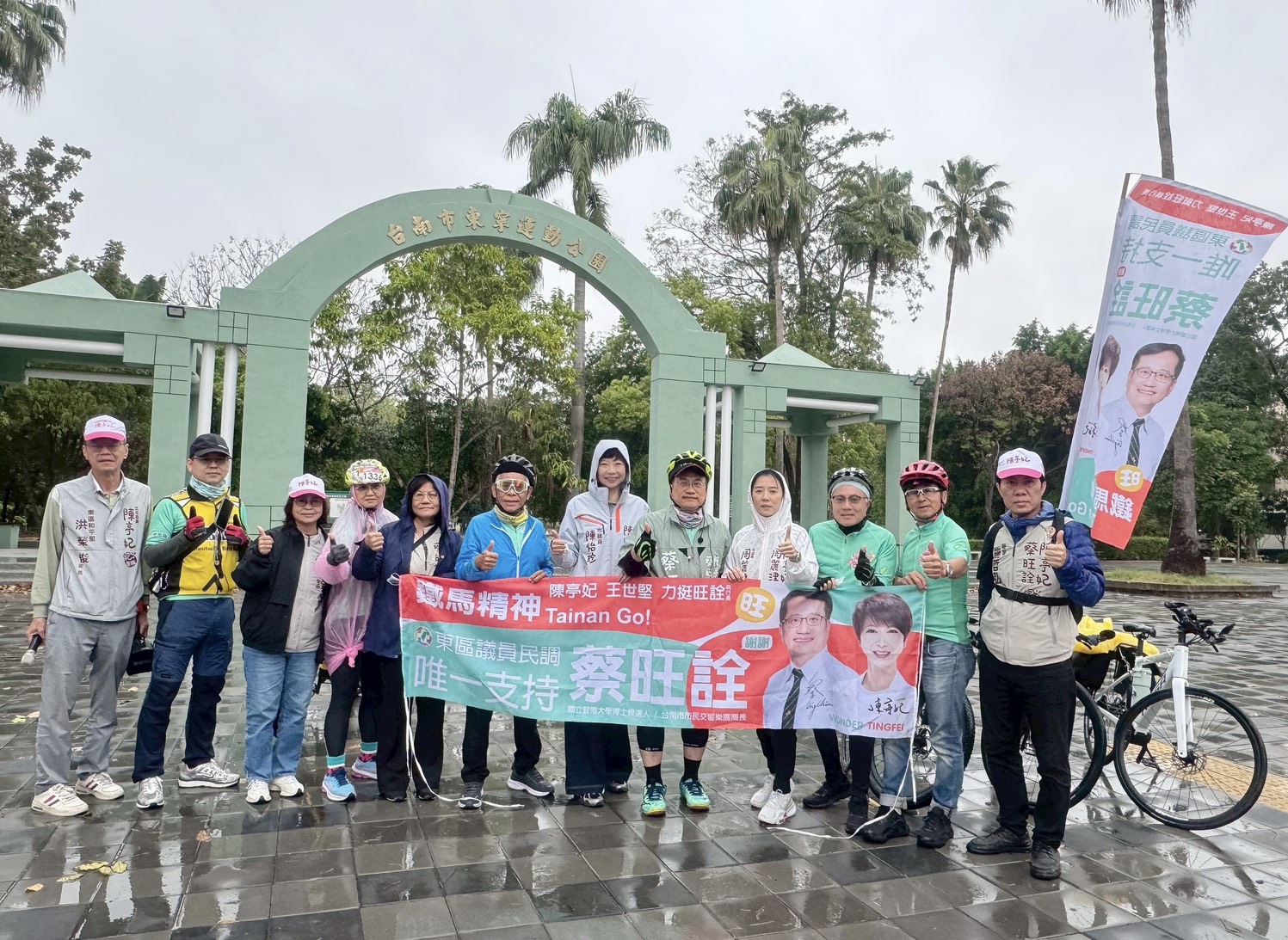 今(4)日清晨,即便天候不佳,蔡旺詮仍在東寧公園向通勤騎士揮手問候,爭取市民支持。包括現任市議員陳怡珍、周麗津等人,也冒雨到場力挺,展現團結氣勢。