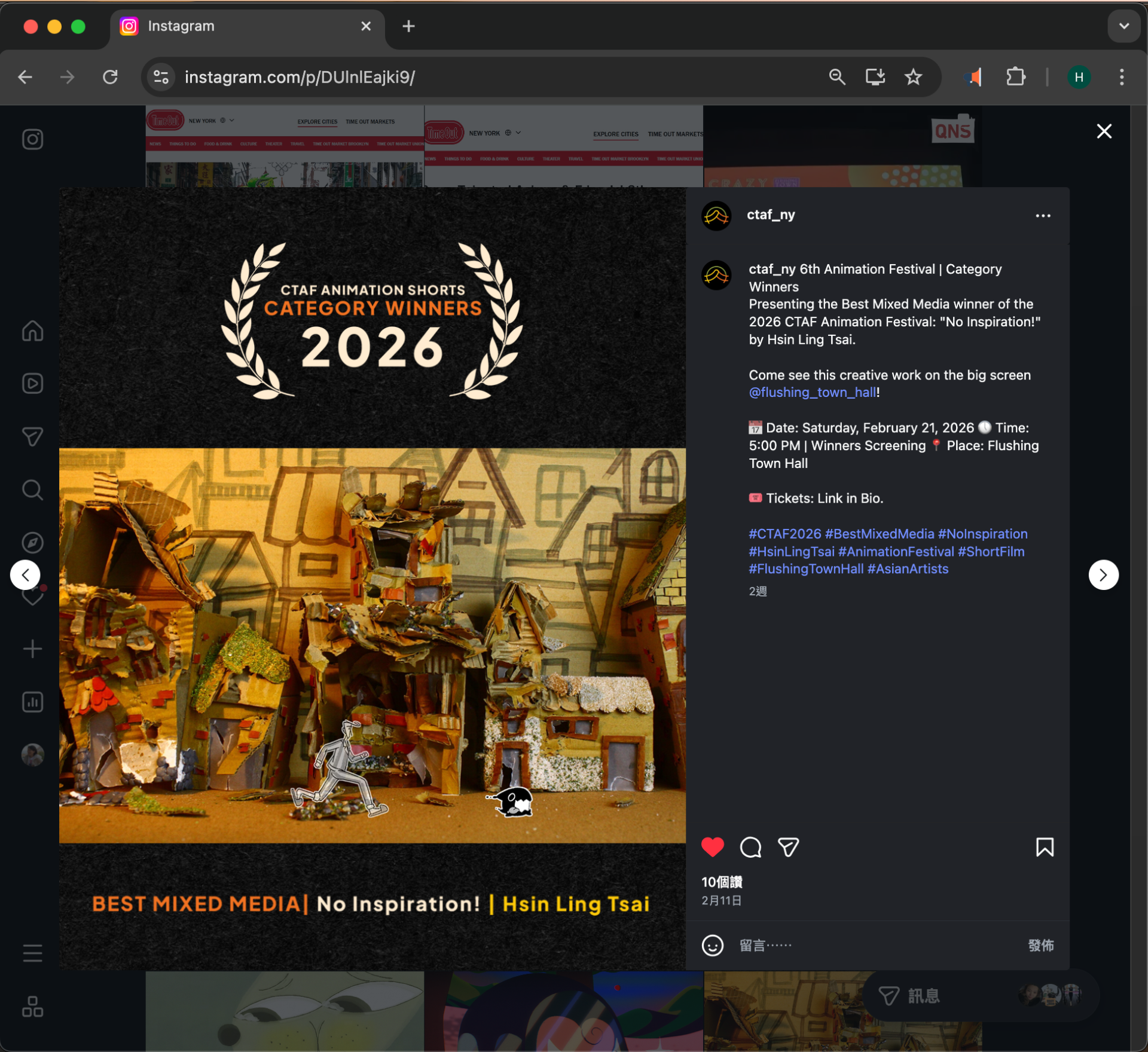 由美國的民間團體 Crazy Talented Asians & Friends(瘋狂才華洋溢的亞裔和朋友們)主辦的第六屆CTAF動畫節,於2月21日下午在紐約 Flushing Town Hall(法拉盛市政廳)隆重舉行得獎作品播映會與交流會。 自2019年創辦首屆CTAF動畫節以來,規模逐年成長,每年徵集逾1,000件來自全球各地的動畫作品參賽。透過高度競爭且獨立運作的專業評審遴選機制,最終僅選出20多部得獎動畫短片,於具有歷史意義的Flushing Town Hall(法拉盛市政廳)大銀幕放映。