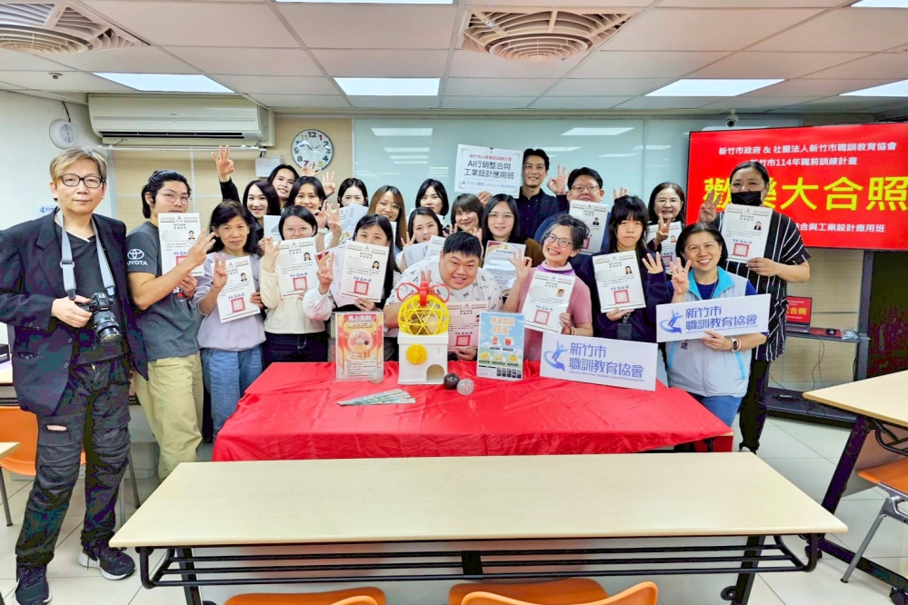 ▲新竹市職訓教育協會鄔佩儒執行長(前排左2)、段煥章老師(前排左3)及AI行銷整合與工業設計應用班全體結訓學員。(圖/新竹市職訓教育協會提供)