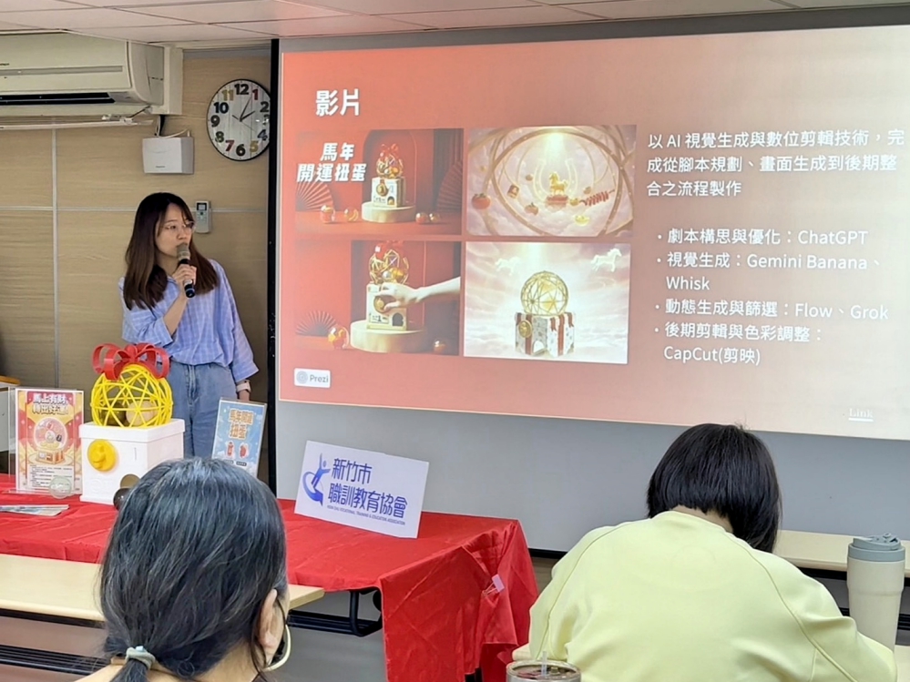 ▲AI行銷整合與工業設計應用班優秀結訓學員上台專題報告。(圖/新竹市職訓教育協會提供)