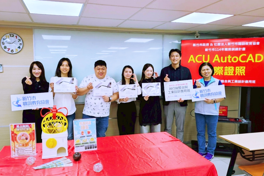 ▲新竹市政府 吳達偉處長(右2)、李蘭珠科長(右1)、新竹市職訓教育協會 鄔佩儒執行長(左1),以及AI行銷整合與工業設計應用班取得AutoCAD國際認證之優秀學員表彰其卓越技術實力。(圖/新竹市職訓教育協會提供)