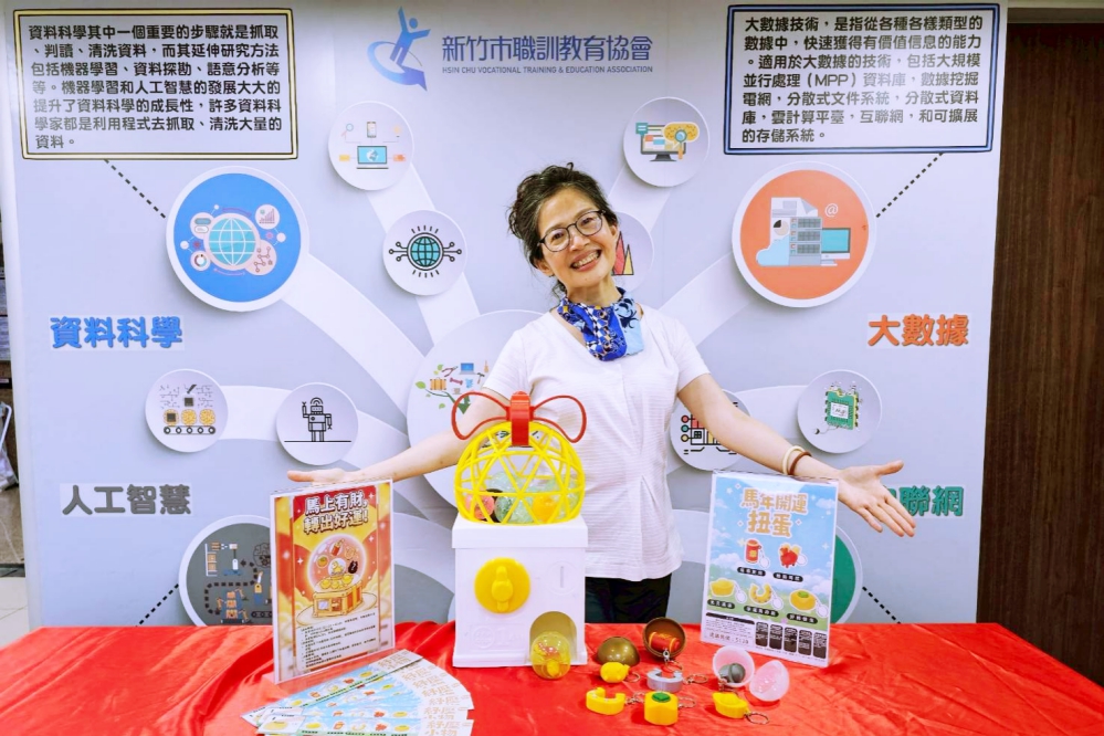 ▲62歲 楊同學與其負責紀錄之專題作品「開運扭蛋機」合影,象徵新竹市政府職訓計畫落實全齡數位教育之初衷。我是楊蕙蘭,感謝新竹職訓中心,我「扭出」了自己的好運,也轉動了更精彩的人生。(圖/新竹市職訓教育協會提供)