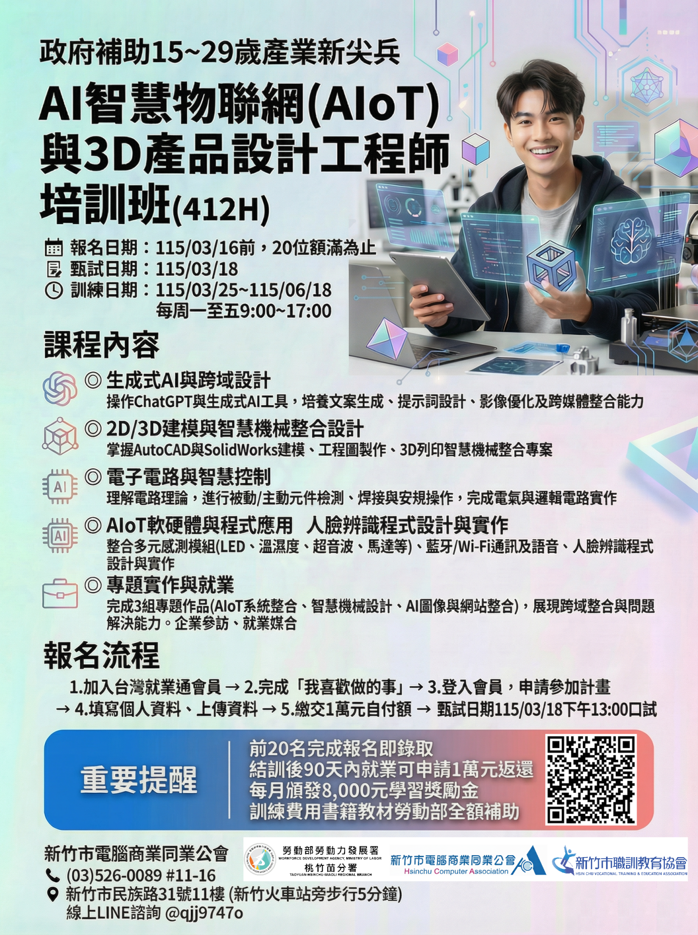 為延續人才轉型動能,新竹市職訓教育協會即日起開放最新「產業新尖兵」計畫─「AI 智慧物聯網 (AIoT) 與 3D 產品設計工程師培訓班」火熱報名!