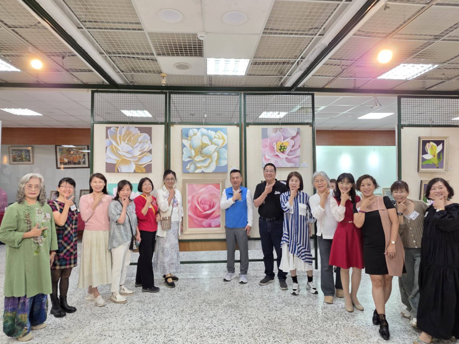 苗栗市公所「花葉琴聲畫展」今(11)日開展,市長余文忠與參展師生及來賓合影。