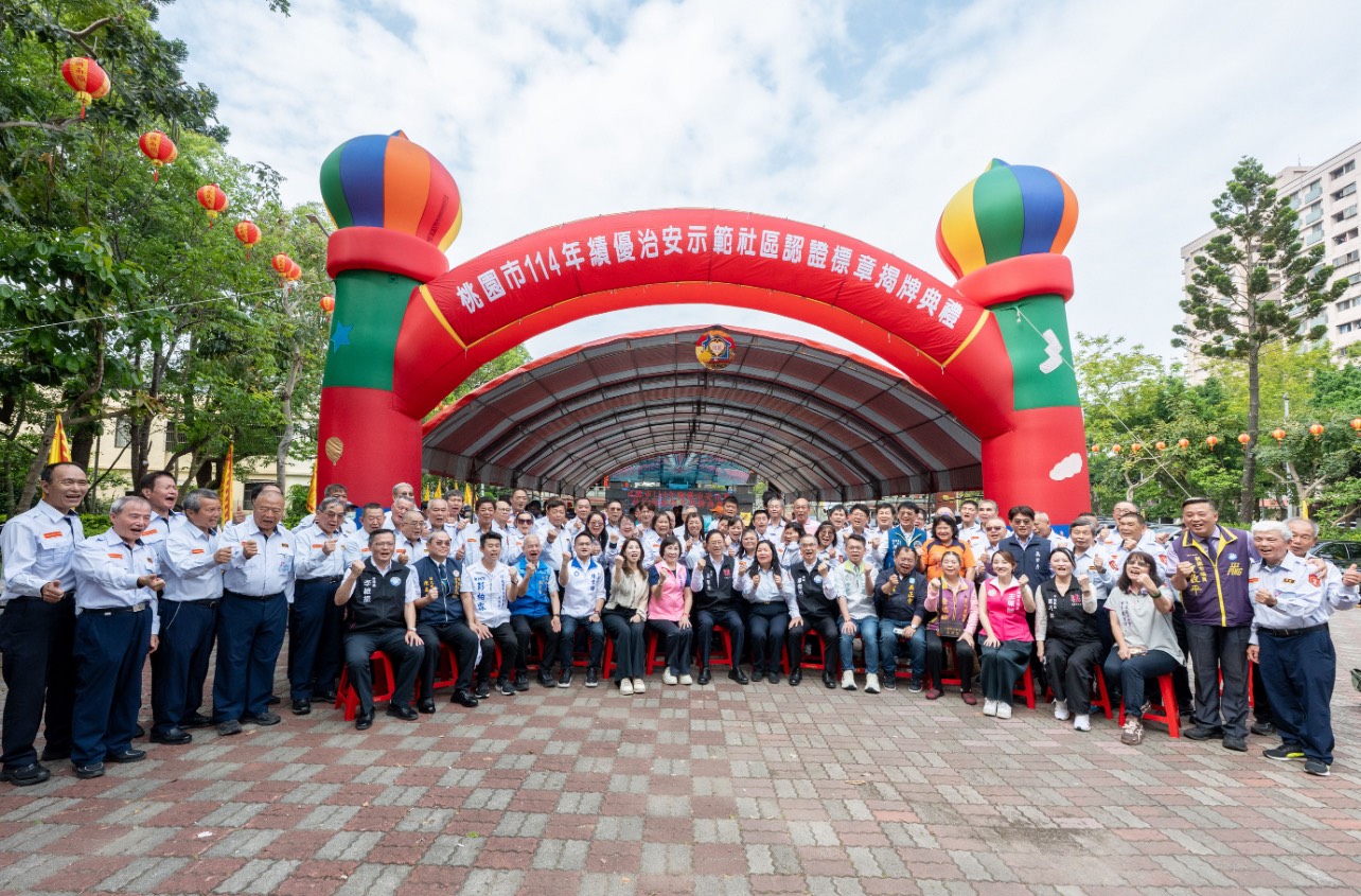 警察局指出,市府每年辦理「桃園市績優治安示範社區認證標章」,評核內容涵蓋警政、社政及消防三大面向,針對隊務運作、防災準備、婦幼安全維護及犯罪協防等項目進行綜合評比,旨在持續強化社區自我防衛機制,營造穩定安心的居住環境。包括立法委員呂玉玲、市議員舒翠玲、黃敬平、陳韋曄、劉仁照、王珮毓、市府警察局長廖恆裕、社會局專門委員李祐銘、消防局簡任技正戴明衫、平鎮區長蕭巧如、平鎮分局分局長李維振及新榮里里長兼守望相助分隊長鄧秀真等均一同出席活動。( 圖/新聞處提供)