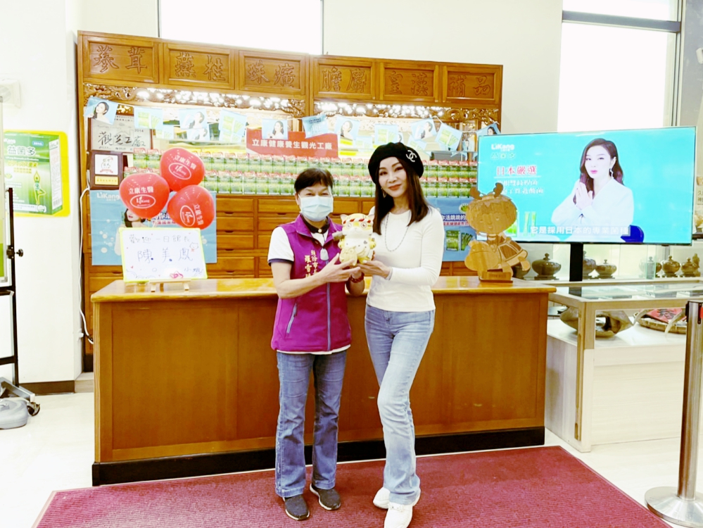 ▲立康生醫邀請臺灣尚水凍齡美女,也是益菌多產品代言人陳美鳳黑貓姐(右)於11月5日擔任一日店長,頭份市大家長羅雪珠也到現場竭誠熱烈接待,為推展在地觀光不遺餘力。(圖/業者提供)