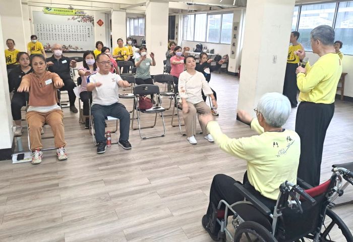 ▲梅門師兄李志恆培訓長照機構負責人示範教導如何讓坐輪椅者也可以運用上肢平甩 以改善身心健康。(圖/新北市政府社會局提供)