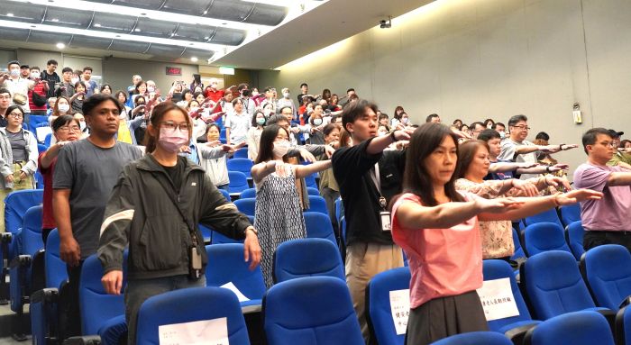 ▲聯繫會報中各機構參與人員一起練習平甩功。(圖/新北市政府社會局提供)